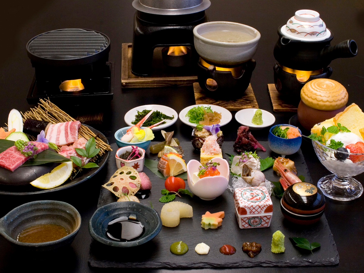 美食プレート会席に地元のお肉3種・陶板焼きをお召し上がりください。