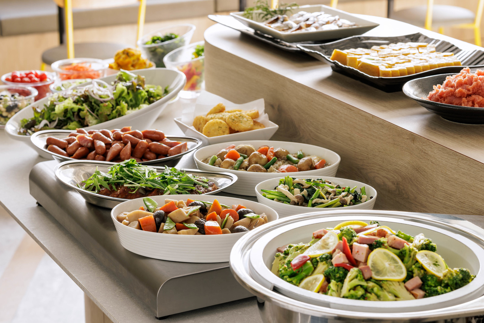 博多名物の辛子明太子、がめ煮はもちろん、おきゅうとなど普段味わうことのできない品をはじめ、地産地消にこだわったメニューや九州各地の郷土料理、またお客様を飽きさせない日替わりメニューなど約30~40種の和洋メニューをビュッフェスタイルにてご提供しております。