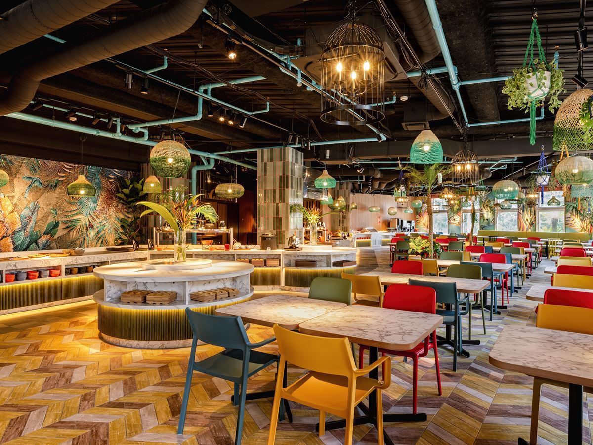 やんばるの森へと開かれた心地よい空間は、沖縄・やんばるの空と森をイメージしたオープンエアテラス。