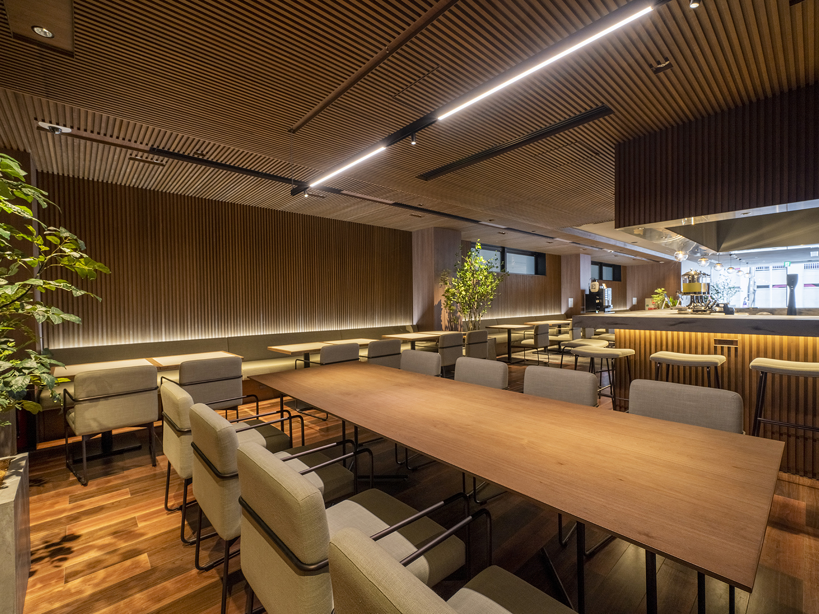 やわらかな木目と緑が生み出す落ち着きのある空間。