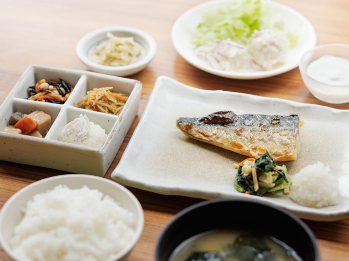 炊きたてのご飯、みそ汁、メインのおかず、副菜がトレーに並ぶバランス抜群の定食をお楽しみください。一品料理もございます。